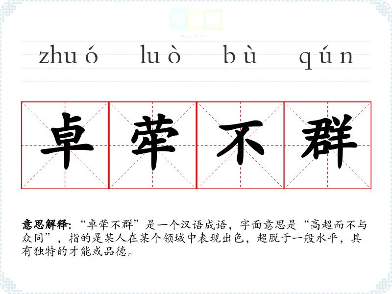“卓荦不群”是一个汉语成语,字面意思是“高超而不与众同”,指的是某人在某个领域中表现出色,超脱于一般水平,具有独特的才能或品德。
