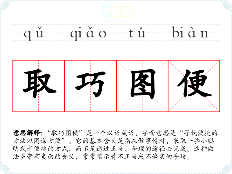 “取巧图便”是一个汉语成语,字面意思是“寻找便捷的方法以图谋方便”。它的基本含义是指在做事情时,采取一些小聪明或者便捷的方式,而不是通过正当、合理的途径去完成。这种做法多带有负面的含义,常常暗示着不正当或不诚实的手段。