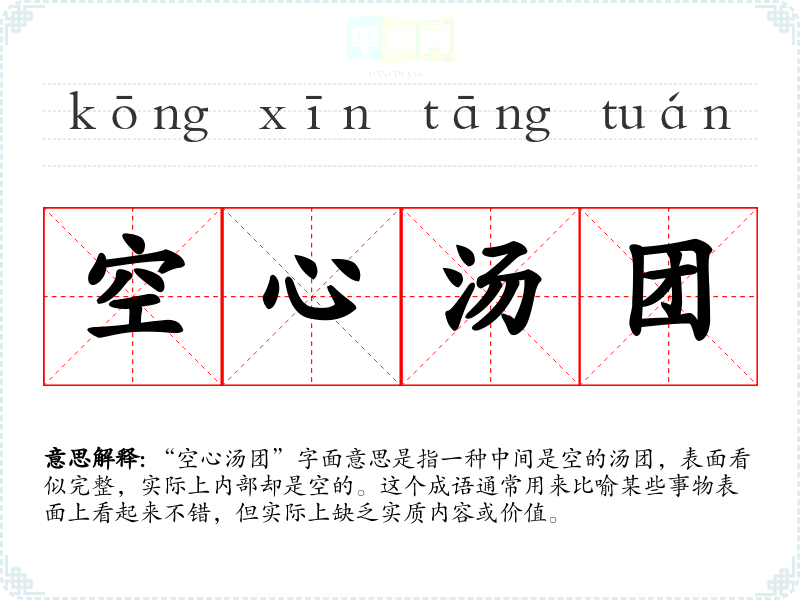 “空心汤团”字面意思是指一种中间是空的汤团,表面看似完整,实际上内部却是空的。这个成语通常用来比喻某些事物表面上看起来不错,但实际上缺乏实质内容或价值。