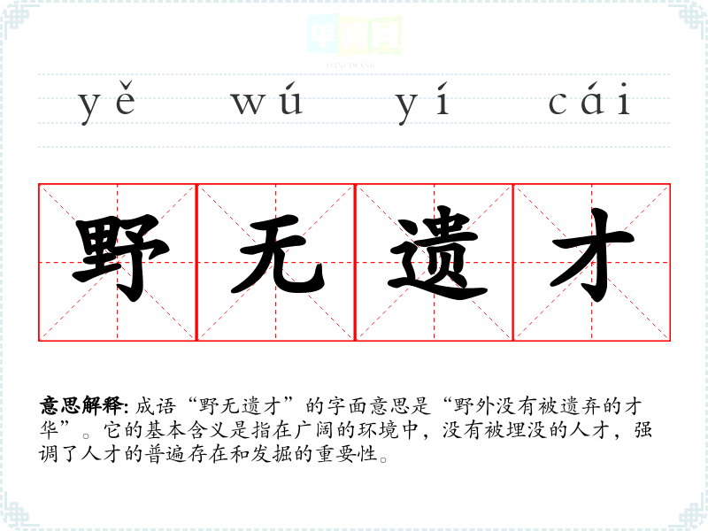 成语“野无遗才”的字面意思是“野外没有被遗弃的才华”。它的基本含义是指在广阔的环境中,没有被埋没的人才,强调了人才的普遍存在和发掘的重要性。
