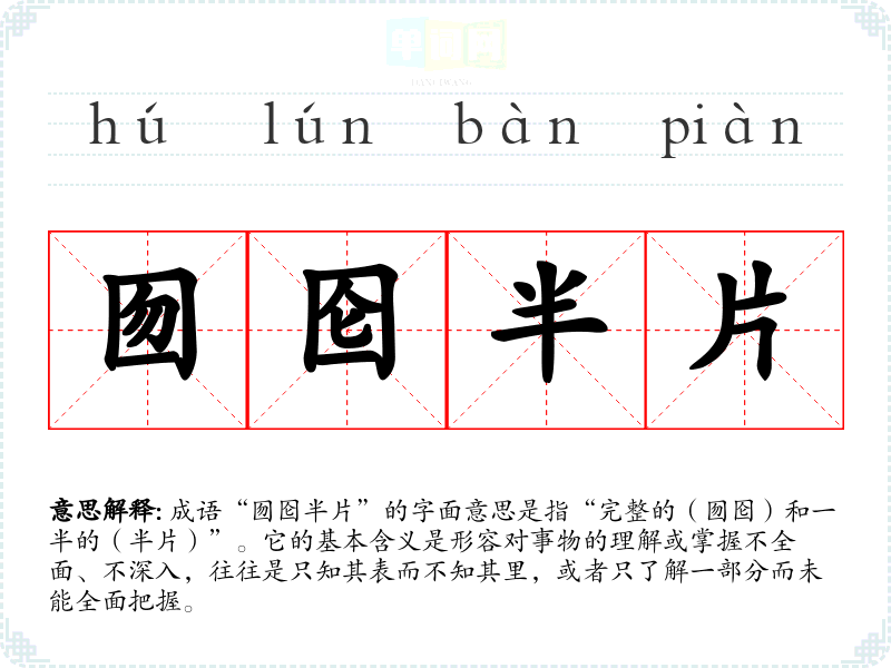 成语“囫囵半片”的字面意思是指“完整的(囫囵)和一半的(半片)”。它的基本含义是形容对事物的理解或掌握不全面、不深入,往往是只知其表而不知其里,或者只了解一部分而未能全面把握。