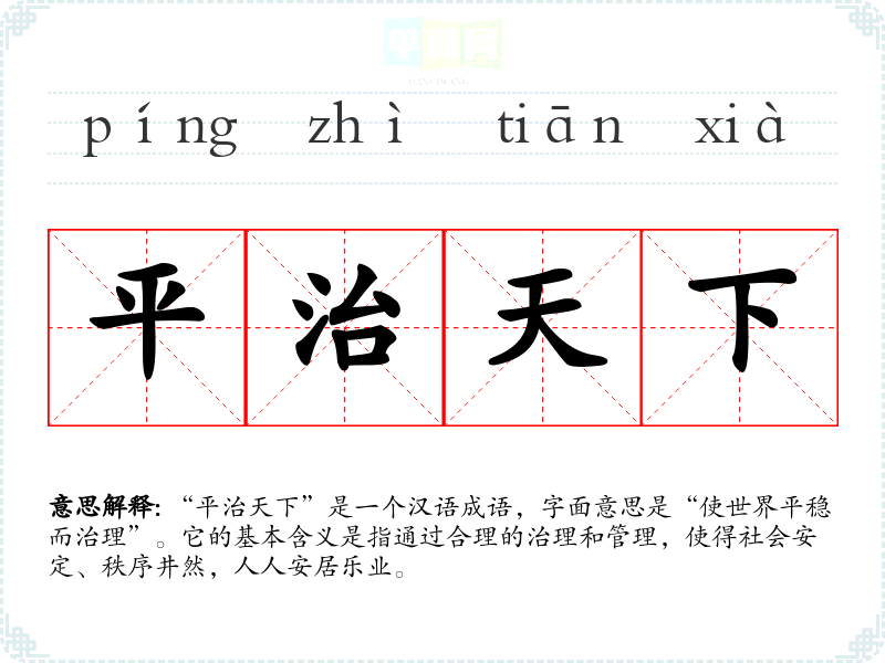 “平治天下”给人一种理想化的感觉,表达了对和平、安定生活的向往。在面对社会动荡和不安时,这个成语更容易引起共鸣,让人反思和期盼。