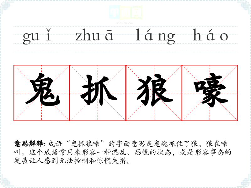 成语“鬼抓狼嚎”的字面意思是鬼魂抓住了狼,狼在嚎叫。这个成语常用来形容一种混乱、恐慌的状态,或是形容事态的发展让人感到无法控制和惊慌失措。