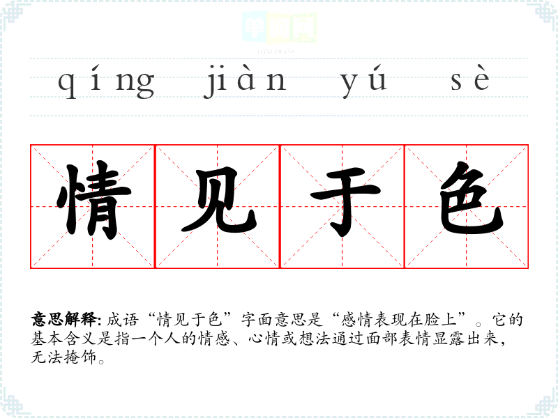 成语“情见于色”字面意思是“感情表现在脸上”。它的基本含义是指一个人的情感、心情或想法通过面部表情显露出来,无法掩饰。