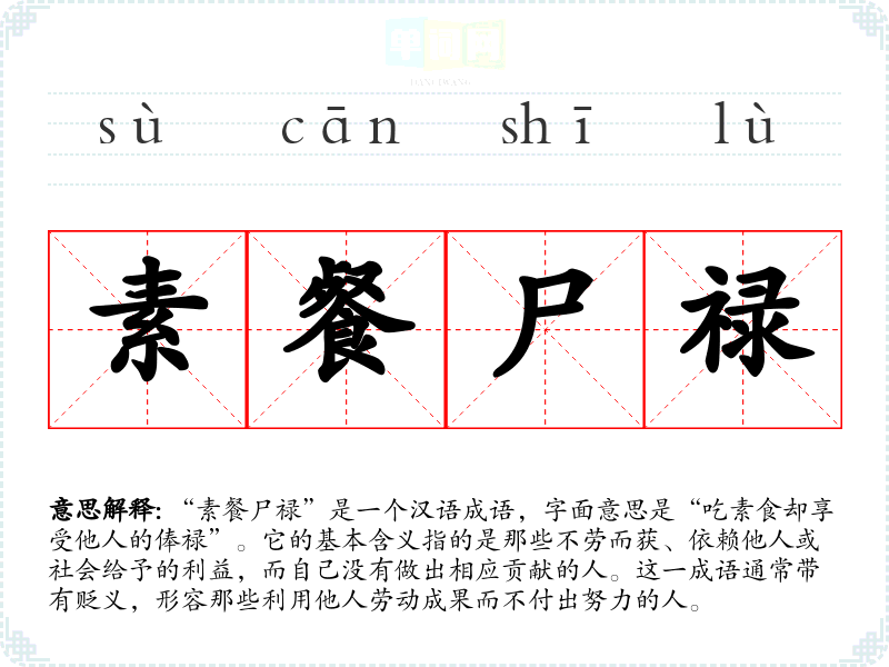 “素餐尸禄”是一个汉语成语,字面意思是“吃素食却享受他人的俸禄”。它的基本含义指的是那些不劳而获、依赖他人或社会给予的利益,而自己没有做出相应贡献的人。这一成语通常带有贬义,形容那些利用他人劳动成果而不付出努力的人。