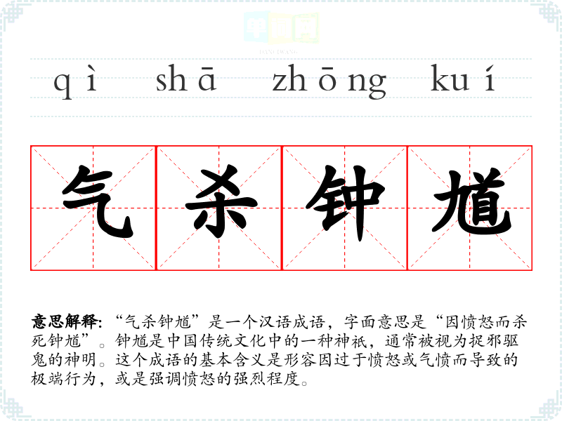 “气杀钟馗”这个成语的来源可以追溯到**历史和民间传说。钟馗的形象源自唐代,是捉拿鬼怪、保卫人间的神灵。传说中,钟馗的性格刚烈,常常因为对邪恶的愤怒而表现出极端的行为。这个成语可能是对钟馗形象的戏谑,强调即便是钟馗这样强大的存在也会因愤怒而失去理智。