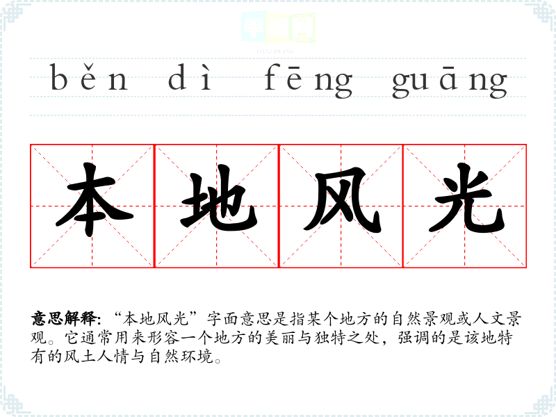 “本地风光”并非传统意义上的成语,而是一个常用词汇,通常在描述某个地区的景色时使用。虽然没有明确的历史背景或典故,但其表达的内容在中国文化中有着深厚的渊源,反映了人们对家乡和故土的热爱。