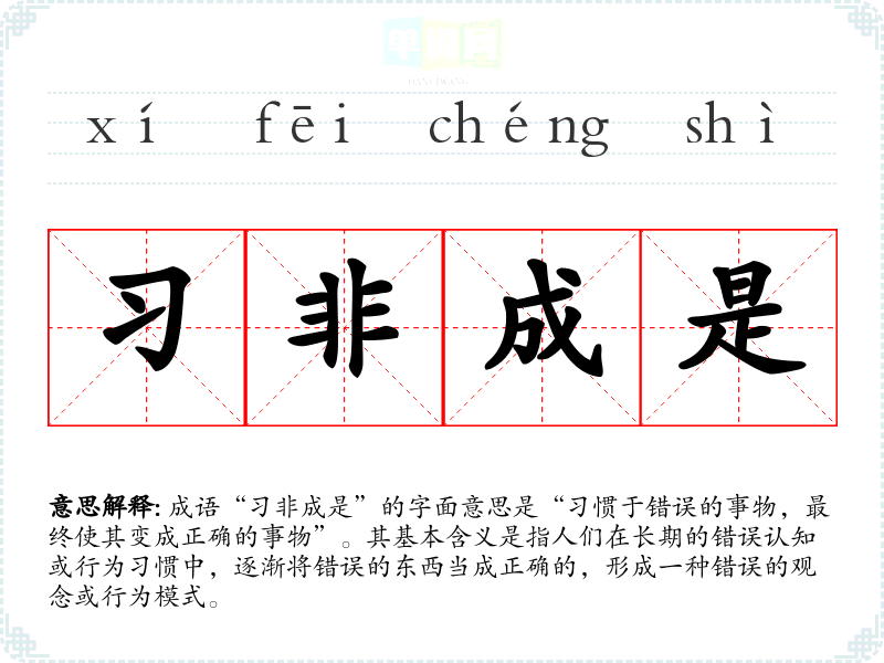 | 习非成是 | 对某些错误事情习惯了,反以为本来就是对的。 |