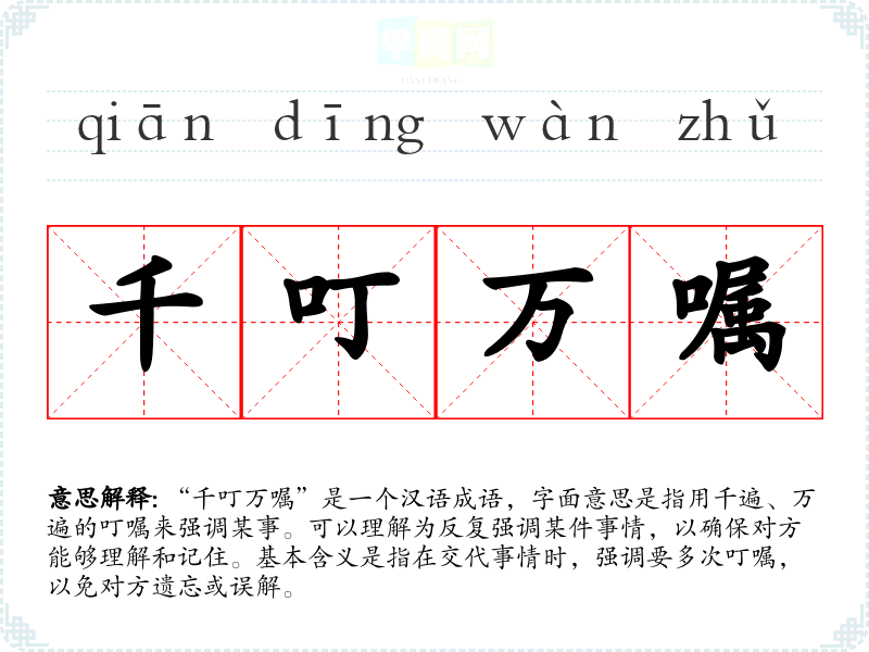 “千叮万嘱”是一个汉语成语,字面意思是指用千遍、万遍的叮嘱来强调某事。可以理解为反复强调某件事情,以确保对方能够理解和记住。基本含义是指在交代事情时,强调要多次叮嘱,以免对方遗忘或误解。