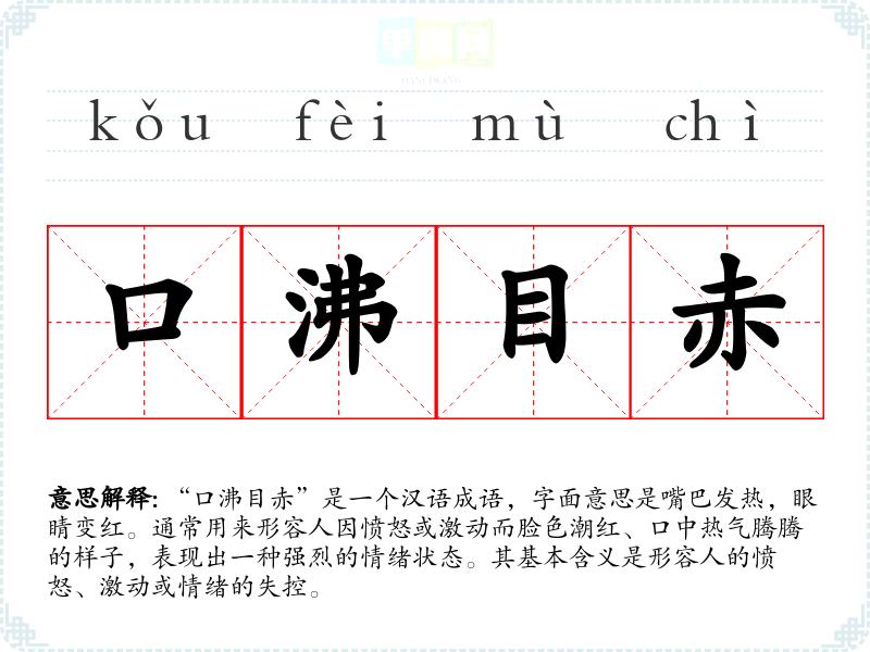“口沸目赤”是一个汉语成语,字面意思是嘴巴发热,眼睛变红。通常用来形容人因愤怒或激动而脸色潮红、口中热气腾腾的样子,表现出一种强烈的情绪状态。其基本含义是形容人的愤怒、激动或情绪的失控。