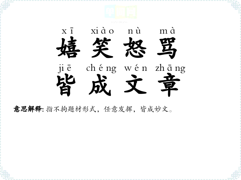 | 嬉笑怒骂,皆成文章 | 指不拘题材形式,任意发挥,皆成妙文。 |