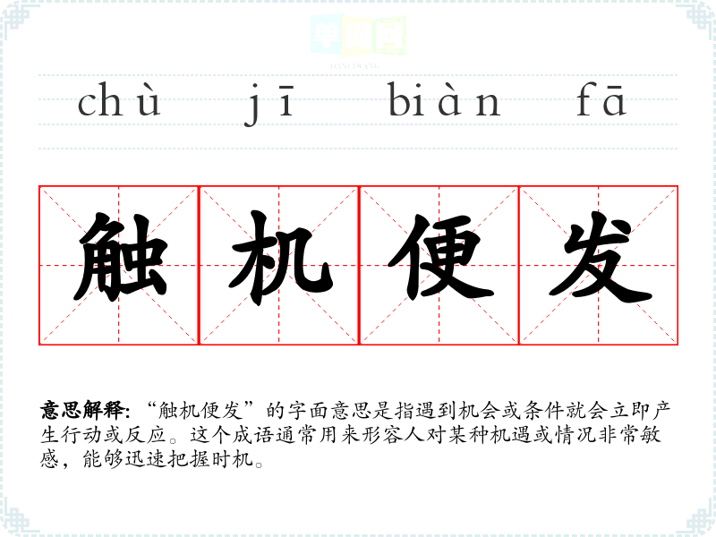 “触机便发”的字面意思是指遇到机会或条件就会立即产生行动或反应。这个成语通常用来形容人对某种机遇或情况非常敏感,能够迅速把握时机。