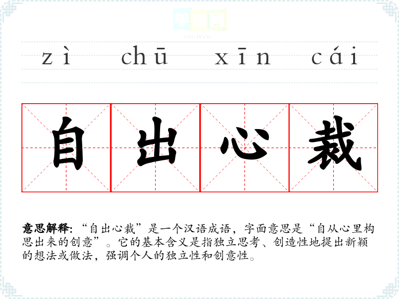 “自出心裁”是一个汉语成语,字面意思是“自从心里构思出来的创意”。它的基本含义是指独立思考、创造性地提出新颖的想法或做法,强调个人的独立性和创意性。