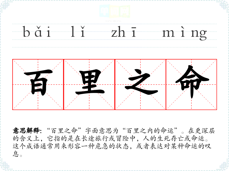 “百里之命”字面意思为“百里之内的命运”。在更深层的含义上,它指的是在长途旅行或冒险中,人的生死存亡或命运。这个成语通常用来形容一种危急的状态,或者表达对某种命运的叹息。