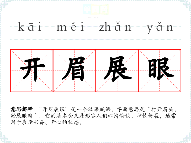 该成语的来源并不明确,但可以追溯到古代诗文中对面部表情的描写。古人常用“眉”和“眼”来形容人的情绪状态,开眉展眼往往与心情的愉悦、轻松相关联。这个成语在汉字文化圈中也较为常见,体现了人们对情绪表达的重视。