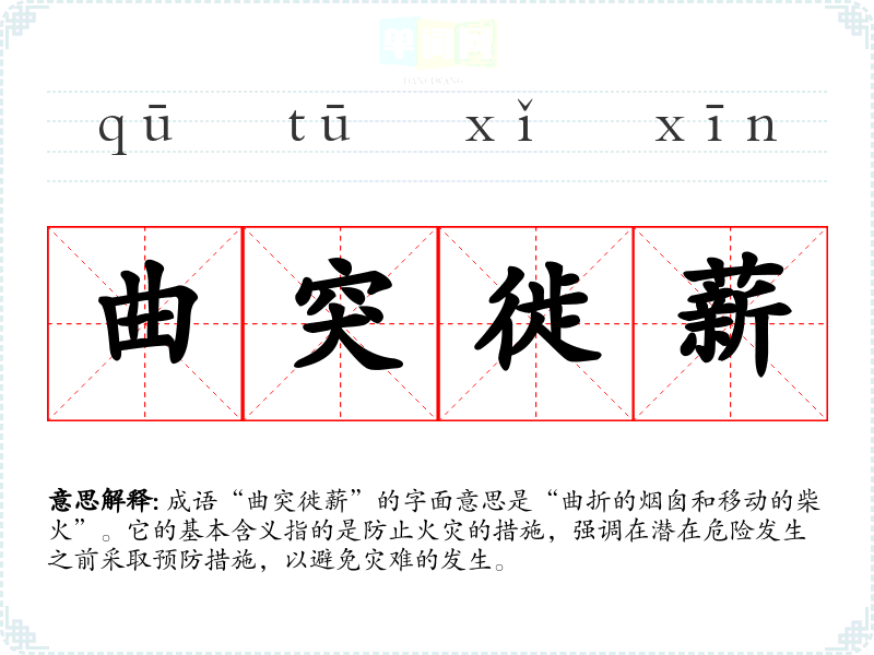 成语“曲突徙薪”的字面意思是“曲折的烟囱和移动的柴火”。它的基本含义指的是防止火灾的措施,强调在潜在危险发生之前采取预防措施,以避免灾难的发生。