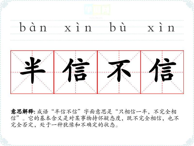 成语“半信不信”字面意思是“只相信一半,不完全相信”。它的基本含义是对某事物持怀疑态度,既不完全相信,也不完全否定,处于一种犹豫和不确定的状态。