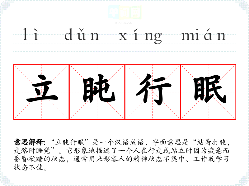 “立盹行眠”是一个汉语成语,字面意思是“站着打盹,走路时睡觉”。它形象地描述了一个人在行走或站立时因为疲惫而昏昏欲睡的状态,通常用来形容人的精神状态不集中、工作或学习状态不佳。