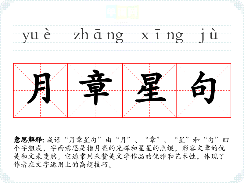 成语“月章星句”由“月”、“章”、“星”和“句”四个字组成,字面意思是指月亮的光辉和星星的点缀,形容文章的优美和文采斐然。它通常用来赞美文学作品的优雅和艺术性,体现了作者在文字运用上的高超技巧。