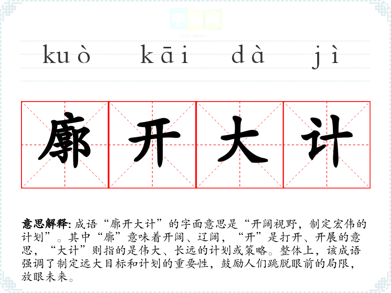 成语“廓开大计”的字面意思是“开阔视野,制定宏伟的计划”。其中“廓”意味着开阔、辽阔,“开”是打开、开展的意思,“大计”则指的是伟大、长远的计划或策略。整体上,该成语强调了制定远大目标和计划的重要性,鼓励人们跳脱眼前的局限,放眼未来。