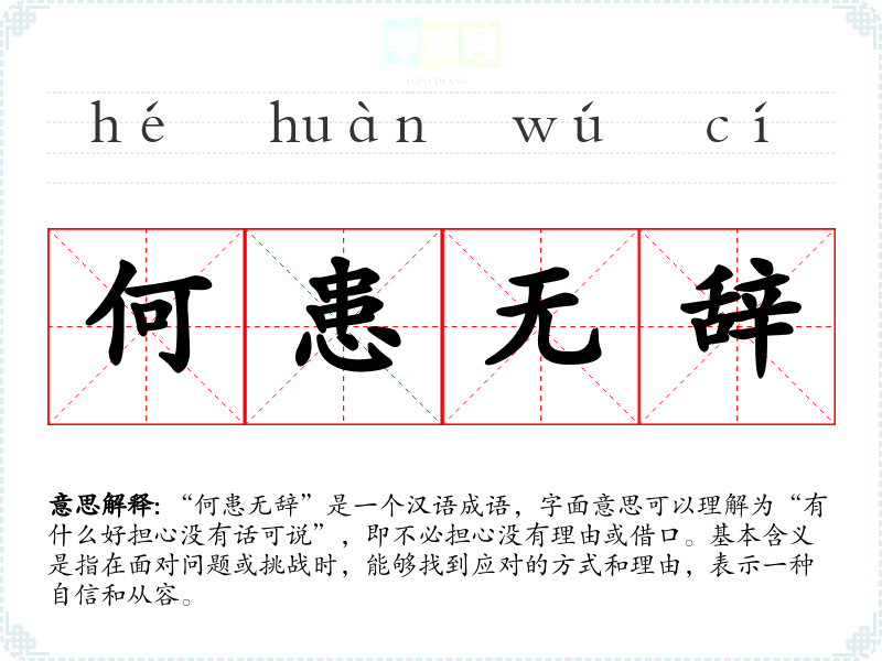 “何患无辞”是一个汉语成语,字面意思可以理解为“有什么好担心没有话可说”,即不必担心没有理由或借口。基本含义是指在面对问题或挑战时,能够找到应对的方式和理由,表示一种自信和从容。