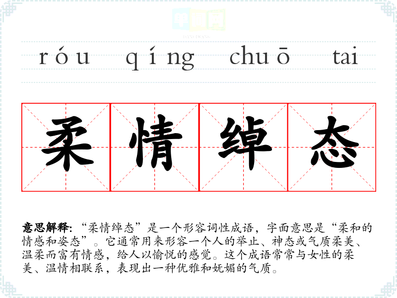 “柔情绰态”是一个形容词性成语,字面意思是“柔和的情感和姿态”。它通常用来形容一个人的举止、神态或气质柔美、温柔而富有情感,给人以愉悦的感觉。这个成语常常与女性的柔美、温情相联系,表现出一种优雅和妩媚的气质。
