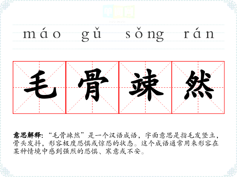 | 毛骨森竦 | 毛:头发和汗毛;骨:脊背。汗毛竖起,脊梁骨发冷。形容非常恐惧。 |