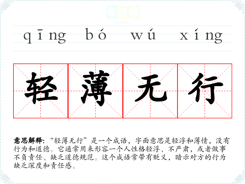 “轻无行”是一个成语,字面意思是轻浮和情,没有行为和道德。它通常用来形容一个人性格轻浮、不严肃,或者做事不负责任、缺乏道德规范。这个成语常带有贬义,暗示对方的行为缺乏深度和责任感。