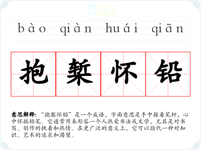 “抱椠怀铅”是一个成语,字面意思是手中握着笔杆,心中怀揣铅笔。它通常用来形容一个人热爱书法或文学,尤其是对书写、创作的执着和热情。在更广泛的意义上,它可以指代一种对知识、艺术的追求和渴望。
