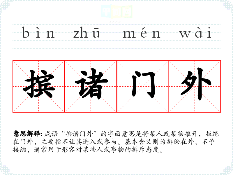成语“摈诸门外”的字面意思是将某人或某物推开,拒绝在门外,主要指不让其进入或参与。基本含义则为排除在外、不予接纳,通常用于形容对某些人或事物的排斥态度。