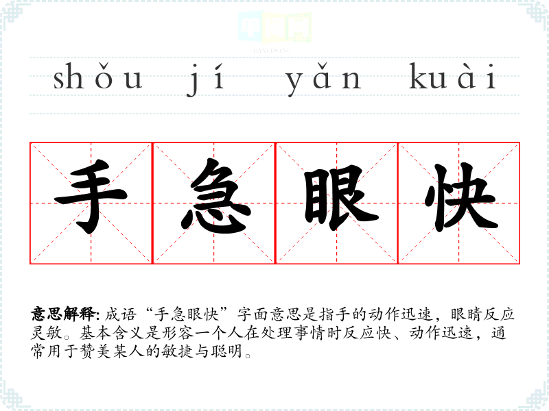 成语“手急眼快”字面意思是指手的动作迅速,眼睛反应灵敏。基本含义是形容一个人在处理事情时反应快、动作迅速,通常用于赞美某人的敏捷与聪明。
