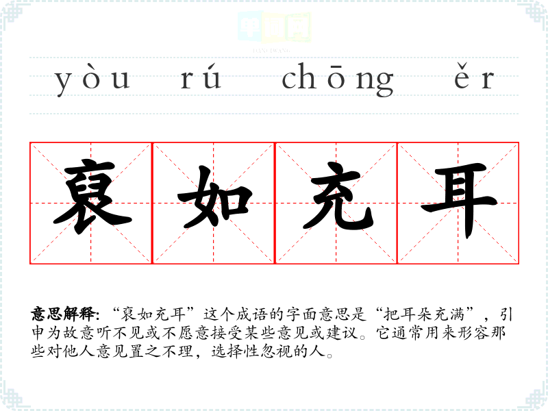“裒如充耳”这个成语的字面意思是“把耳朵充满”,引申为故意听不见或不愿意接受某些意见或建议。它通常用来形容那些对他人意见置之不理,选择性忽视的人。