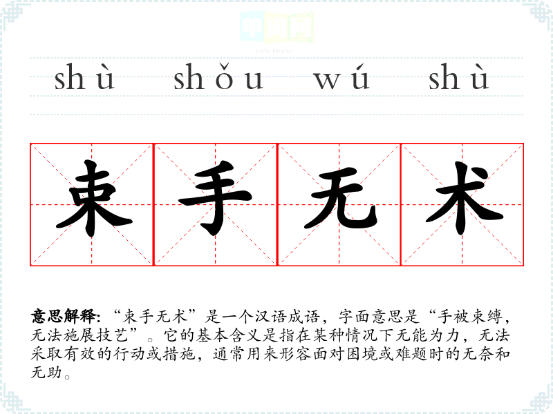 “束手无术”是一个汉语成语,字面意思是“手被束缚,无法施展技艺”。它的基本含义是指在某种情况下无能为力,无法采取有效的行动或措施,通常用来形容面对困境或难题时的无奈和无助。