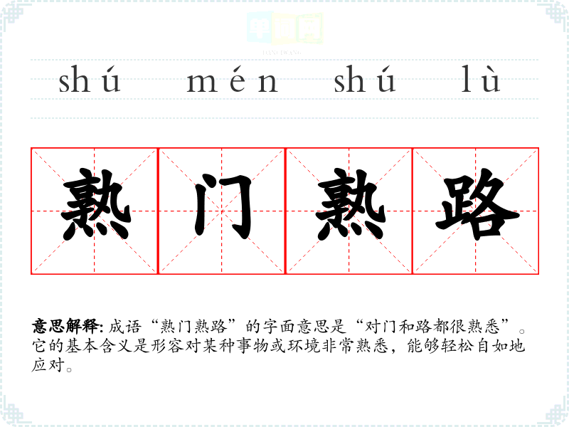 成语“熟门熟路”的字面意思是“对门和路都很熟悉”。它的基本含义是形容对某种事物或环境非常熟悉,能够轻松自如地应对。