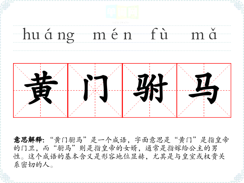 “黄门驸马”是一个成语,字面意思是“黄门”是指的门卫,而“驸马”则是指的女婿,通常是指嫁给公主的男性。这个成语的基本含义是形容地位显赫,尤其是与皇室或权贵关系密切的人。