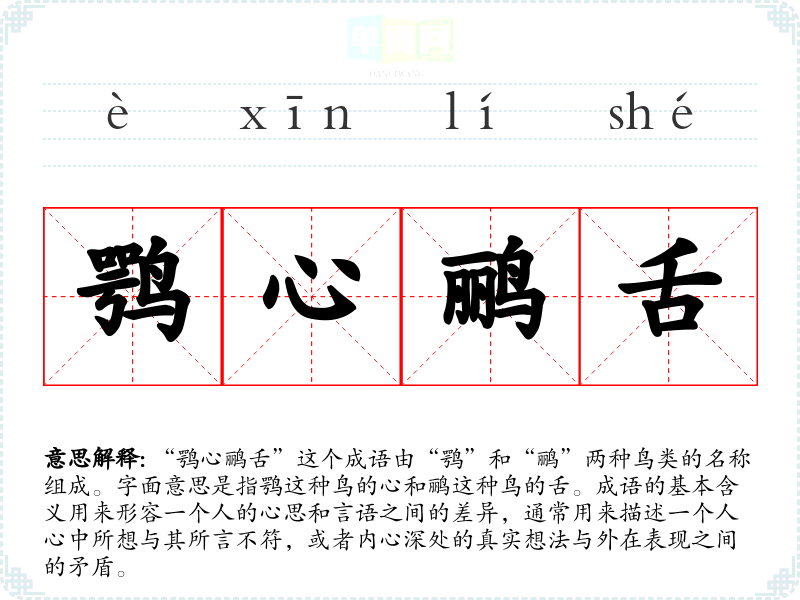 “鹗心鹂舌”这个成语由“鹗”和“鹂”两种鸟类的名称组成。字面意思是指鹗这种鸟的心和鹂这种鸟的舌。成语的基本含义用来形容一个人的心思和言语之间的差异,通常用来描述一个人心中所想与其所言不符,或者内心深处的真实想法与外在表现之间的矛盾。