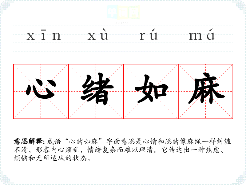 成语“心绪如麻”字面意思是心情和思绪像麻绳一样纠缠不清,形容内心烦乱,情绪复杂而难以理清。它传达出一种焦虑、烦恼和无所适从的状态。