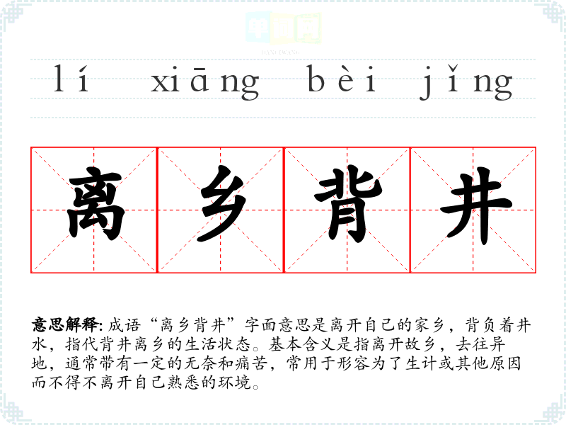 成语“离乡背井”字面意思是离开自己的家乡,背负着井水,指代背井离乡的生活状态。基本含义是指离开故乡,去往异地,通常带有一定的无奈和痛苦,常用于形容为了生计或其他原因而不得不离开自己熟悉的环境。
