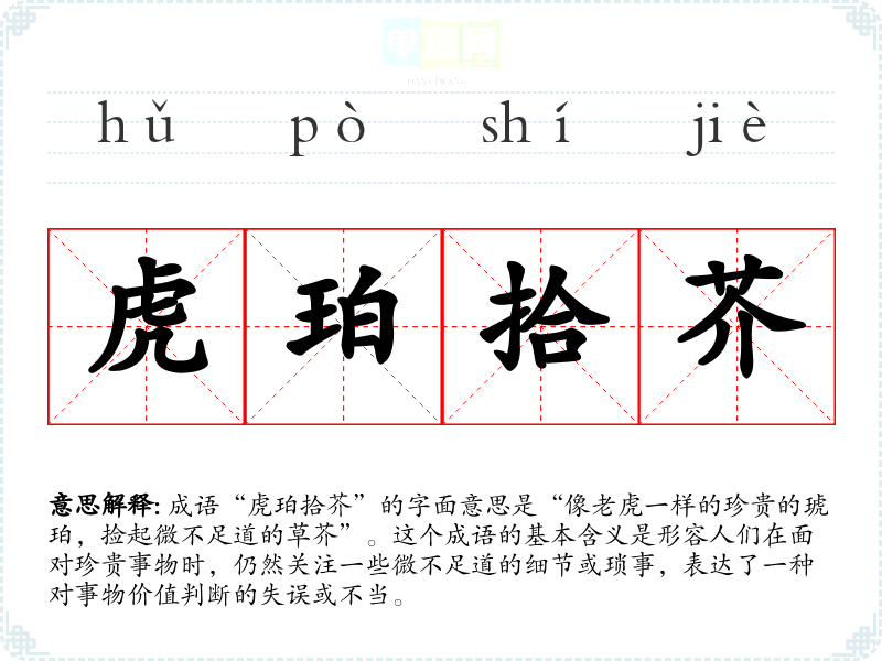 “虎珀”指的是珍贵的琥珀,象征着贵重的事物;而“拾芥”则是指捡起草芥,草芥是指无足轻重的小事。这个成语的来源并不十分明确,但可以追溯到古代的典故或文学作品中,常常用以讽刺或批评一些人在追求大事时却过于关注细节的行为。