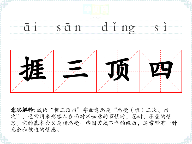 成语“捱三顶四”字面意思是“忍受(捱)三次、四次”,通常用来形容人在面对不如意的事情时,忍耐、承受的情形。它的基本含义是指忍受一些困苦或不幸的经历,通常带有一种无奈和被迫的情感。