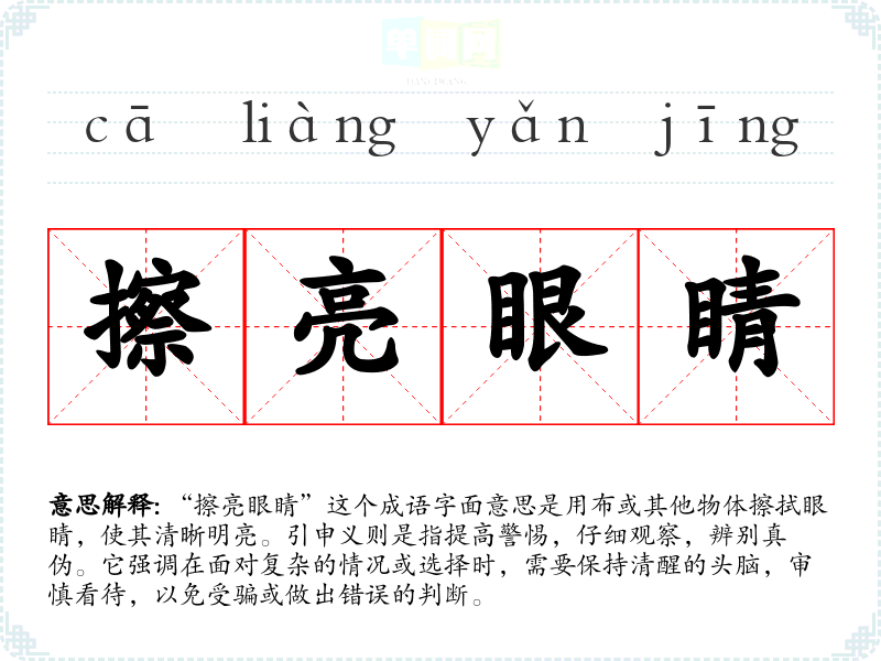 “擦亮眼睛”这个成语字面意思是用布或其他物体擦拭眼睛,使其清晰明亮。引申义则是指提高警惕,仔细观察,辨别真伪。它强调在面对复杂的情况或选择时,需要保持清醒的头脑,审慎看待,以免受骗或做出错误的判断。