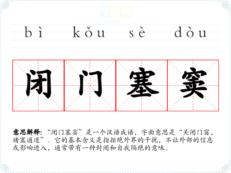 “闭门塞窦”是一个汉语成语,字面意思是“关闭门窗,堵塞通道”。它的基本含义是指拒绝外界的干扰,不让外部的信息或影响进入,通常带有一种封闭和自我隔绝的意味。