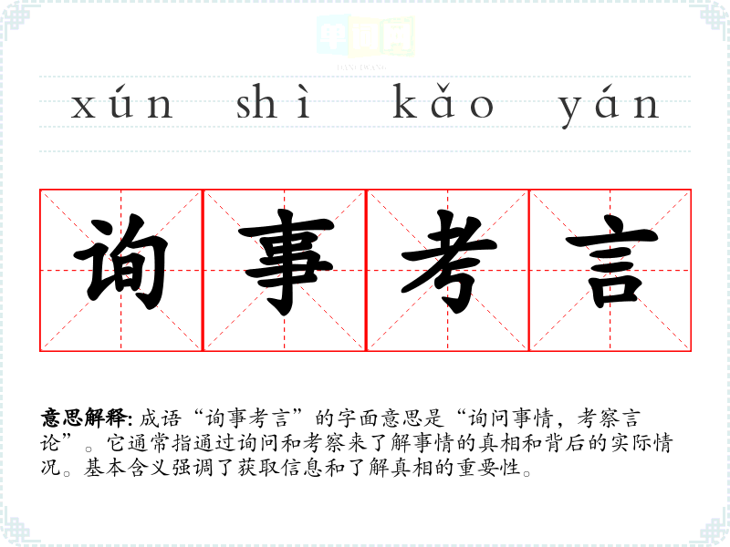 成语“询事考言”的字面意思是“询问事情,考察言论”。它通常指通过询问和考察来了解事情的真相和背后的实际情况。基本含义强调了获取信息和了解真相的重要性。