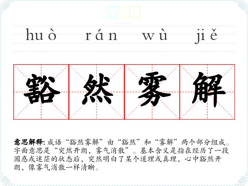 成语“豁然雾解”由“豁然”和“雾解”两个部分组成。字面意思是“突然开朗,雾气消散”。基本含义是指在经历了一段困惑或迷茫的状态后,突然明白了某个道理或真理,心中豁然开朗,像雾气消散一样清晰。