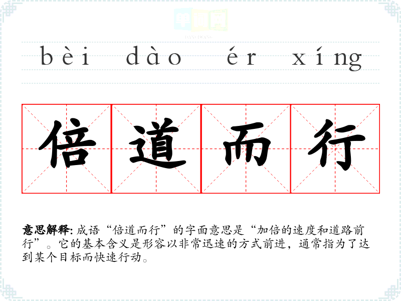 - 这些成语也表达了快速行动的意思,但“倍道而行”更强调加倍的努力和速度。