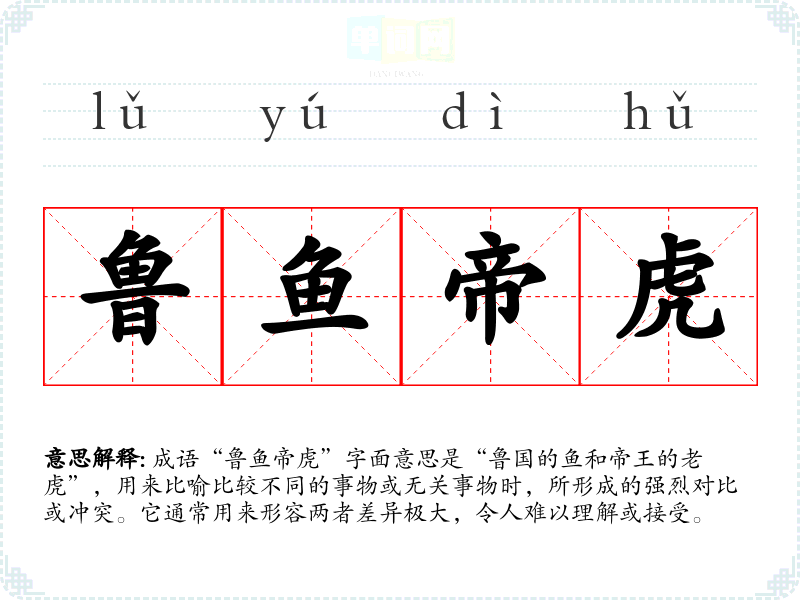 成语“鲁鱼帝虎”字面意思是“鲁国的鱼和帝王的**”,用来比喻比较不同的事物或无关事物时,所形成的强烈对比或冲突。它通常用来形容两者差异极大,令人难以理解或接受。