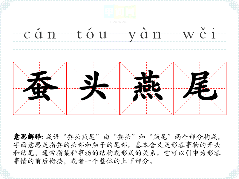 成语“蚕头燕尾”由“蚕头”和“燕尾”两个部分构成。字面意思是指蚕的头部和燕子的尾部。基本含义是形容事物的开头和结尾,通常指某种事物的结构或形式的关系。它可以引申为形容事情的前后衔接,或者一个整体的上下部分。