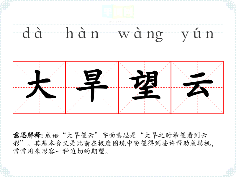 成语“大旱望云”字面意思是“大旱之时希望看到云彩”。其基本含义是比喻在极度困境中盼望得到些许帮助或转机,常常用来形容一种迫切的期望。