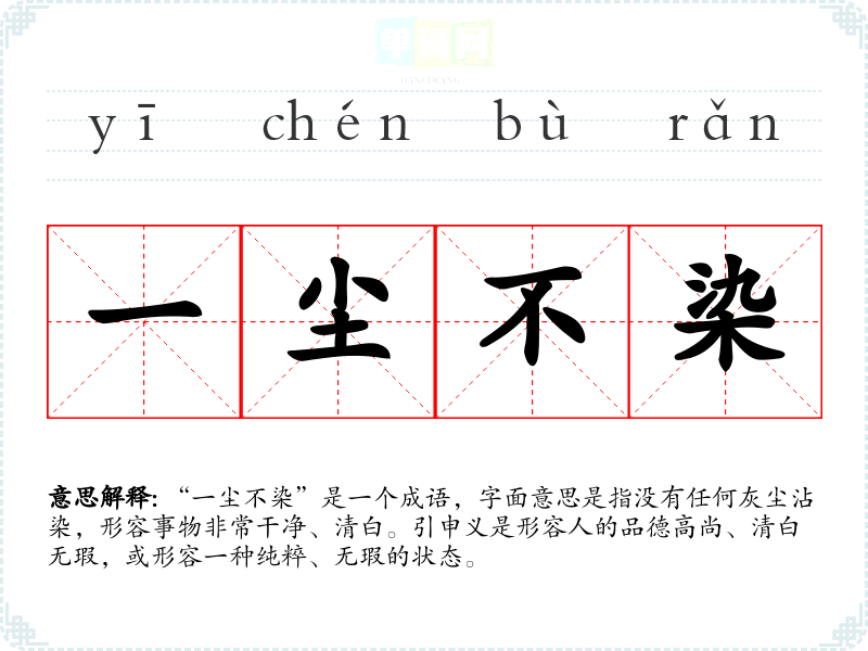 | 无一尘染 | 原指佛教徒修行时,排除物欲,保持心地洁净。现泛指丝毫不受坏习惯,坏风气的影响。也用来形容非常清洁、干净。 |