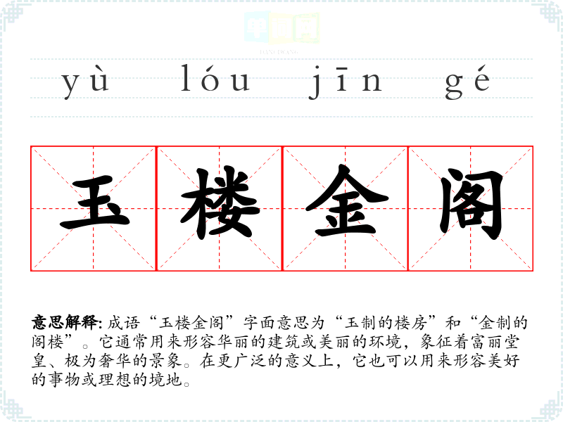 成语“玉楼金阁”字面意思为“玉制的楼房”和“金制的阁楼”。它通常用来形容华丽的建筑或美丽的环境,象征着富丽堂皇、极为奢华的景象。在更广泛的意义上,它也可以用来形容美好的事物或理想的境地。